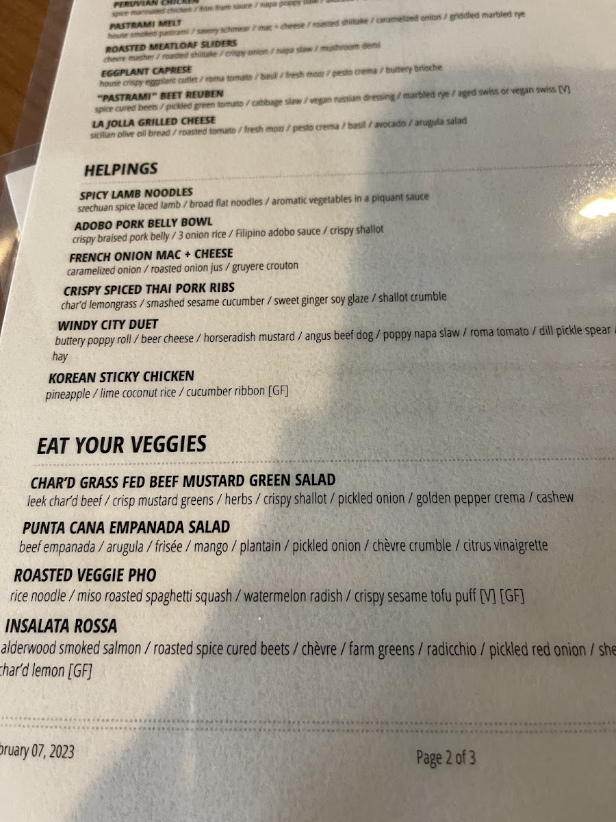 The vegetarian dishes shine with the Roasted Veggie Pho, a medley of fresh ingredients like miso roasted spaghetti squash and sesame tofu puff for $16.19. For sandwich lovers, the Pastrami Melt stands out with a rich blend of cheeses and caramelized onions, available at $18.49.